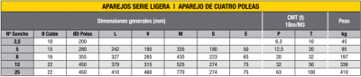 • Polea: 4 (8 ramales). Laminada soldada o de plástico (Nylon). Tamaño máx.450 mm (diámetro interior)